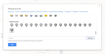 My Maps provides a standard set of icons that can be used for labelling places - and these days it's a pretty impressive standard set. But it still doesn't include numbers, letters or other labels - and the icons provided may not be styled the way you would like.
